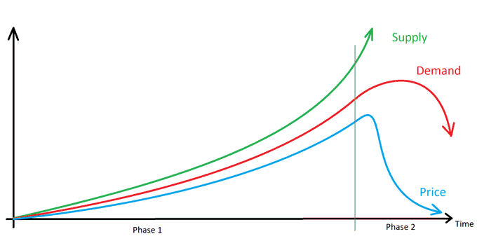 Even if the demand was the same every day, because the supply increases exponentially, the price will inevitably fall.